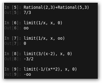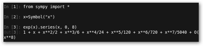 Lanzamos IPython (un entorno de Python) en Ubuntu desde el terminal, escribiendo ipython –pylab. Veamos lo que podemos realizar con esta librería: * Para trabajar con ella debemos primero importarla (In[1]) * In[2]: Definimos x como una de nuestras variables. * In[3]: Desarrollo en serie de Taylor de la exponencial (exp(x)), en el punto 0. * In[5]: Suma de fracciones. * In[6]-In[9]: Solicitamos la realización de distintos límites. |