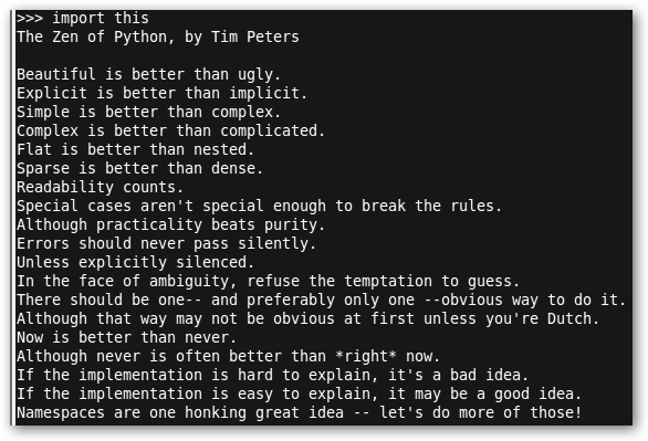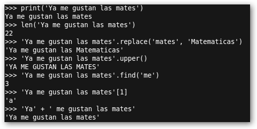 Si quieres saber los principios de diseño de Python, su Zen, escribe en la consola import this. Observa en la figura inferior el tratamiento de las cadenas en Python. Hemos imprimido la cadena (print), calculado su longitud (len), reemplazado una palabra por otra (replace), convertido a mayúsculas (upper) y encontrado una subcadena (find). Considera que el primer carácter de la cadena está en la posición 0, el segundo en la 1 (‘cadena’[1]), etc. Finalmente, hemos concatenado dos cadenas (‘+’). |