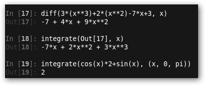 * In[18]: Realizamos la integral indefinida de la salida Out[17], es decir, de -7+4x+9x2. * In[19]: Solicitamos una integral definida de la función 2cos(x)+sin(x) en el intervalo [0, Pi]. |