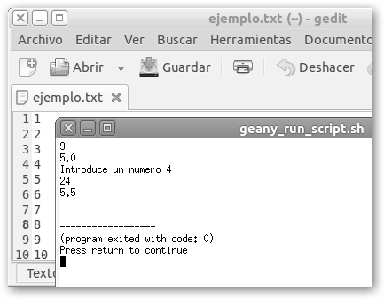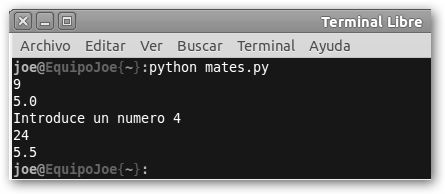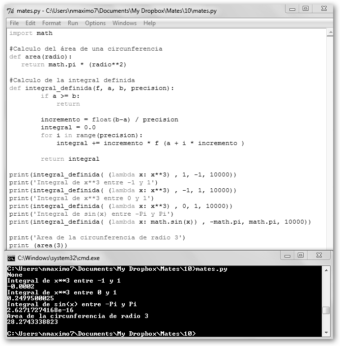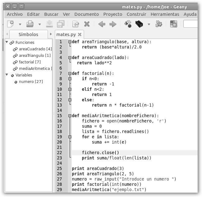 Se ha definido una función que calcula el área de la circunferencia (recuerda Pi*radio2) y otra, la integral definida de la función “f” desde “a” hasta “b”. Ésta se obtiene sumando las áreas de los rectángulos con base “incremento” y altura “f(a + i*incremento)” donde i varía entre 0 y precisión-1. Observa que con lambda definimos funciones anónimas (sin nombre), por ejemplo, x2 +1 sería lambda x: x**2 +1. A continuación, mostramos otro ejemplo realizado en Ubuntu. Definimos dos funciones bastante básicas: areaTriangulo y areaCuadrado que calculan las áreas de triángulos y cuadrados con las fórmulas clásicas: (base*altura)/2 y lado2. La función factorial se muestra como el ejemplo clásico del uso de la recursión en Python. Más interesante es mediaAritmetica, principalmente porque muestra cómo podemos trabajar con ficheros en Python. Esta función calcula la media aritmética de los números que están almacenados en el archivo que se le pasa como parámetro. Primero, abrimos el fichero en modo lectura: fichero = open(nombreFichero, 'r'). Luego, leemos “del tirón” todo su contenido en una única instrucción: lista = fichero.readlines(). Finalmente, liberamos los recursos que fichero está usando y reteniendo con fichero.close(). Si el archivo es muy voluminoso tendríamos que plantearnos leerlo línea a línea, por ejemplo: for linea in fichero: print linea También, se ilustra como leer datos desde consola (numero = raw_input("Introduce un numero ")) y realizar la conversión de texto a entero (int(numero)).