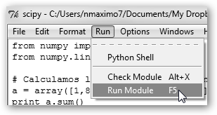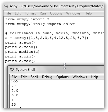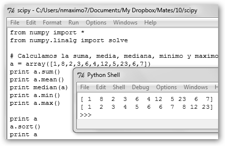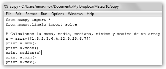A partir de ahí definimos un array a = array([1,8,…,7]) y calculamos la suma, la media, la mediana, su mínimo y su máximo. En Python 3, la llamada print a.sum() no funciona, deberás escribir print(a.sum()). |