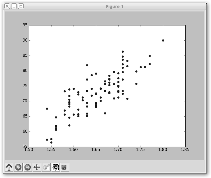 2. Con plot(alturah, pesoh, ‘o’) dibujamos la relación existente entre la altura y el peso de los hombres. Observa la figura inferior. |