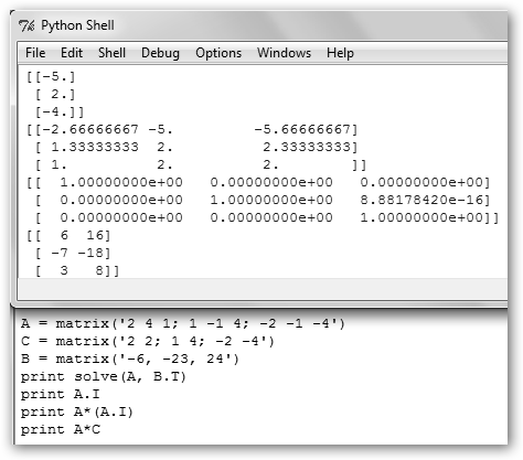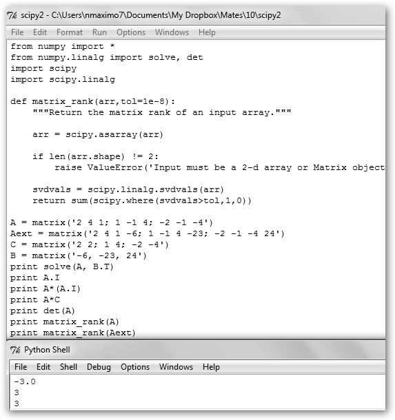 Observa la segunda línea: from numpy.linalg import solve, det, hemos importado una nueva función det, para calcular el determinante de A con det(A), es igual a -3. Luego, comprobamos que el rango de la matriz de coeficientes (matrix_rank(A)) y la extendida (matrix_rank(Aext)) son iguales a 3 y como el número de ecuaciones 3 es igual al número de incógnitas, volvemos a tener un sistema de ecuaciones compatible y con una única solución. Sin embargo, no encontramos soporte nativo para la función rango, hemos tenido que utilizar una propuesta (pero todavía no oficial) en http://osdir.com/ml/python.numeric.general/ 2006-02/msg00154.html. |