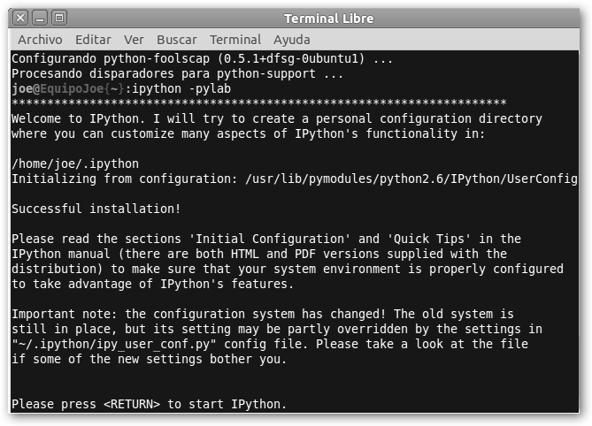 ¡Cambiemos de sistema operativo! ¿No era Python multiplataforma? Recuerda que ya instalamos en el apartado anterior las librerías necesarias. Desde un terminal escribe ipython –pylab para iniciar la sesión, con el argumento pylab podemos trabajar interactivamente con mathplotlib. |