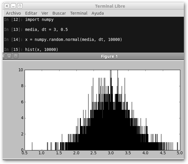 Observa que hemos importado la librería numpy, definido dos variables que serán la media y la desviación típica: media, dt. Con x generamos una colección de números aleatorios que siguen una distribución normal de media 3 y desviación típica 0.5. El tercer argumento de normal es el número de elementos que se desea que se generen. Este último dato también es necesario para que hist nos muestre el histograma. |