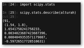 5. En la librería scipy.stats tenemos un buen número de funciones de utilidad (scipy es tan grande que tenemos que importar sus partes por separado), por ejemplo describe. Ésta devuelve el tamaño de la muestra, el mínimo y el máximo, la media aritmética, la varianza, los coeficientes de asimetría y curtosis. |