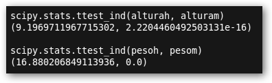 8. La función ttest_ind realiza un T-test, un contraste sobre las medias de dos muestras independientes y devuelve el estadístico t y la significación. Como en ambos casos las probabilidades están muy próximas a cero (p.05) se rechaza la hipótesis nula de igualdad de medias, es decir, la media de los pesos y las alturas son distintas por géneros. |
