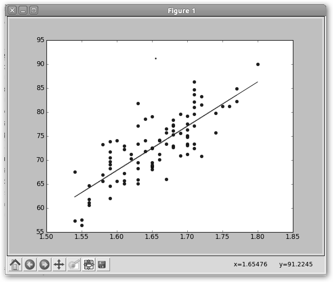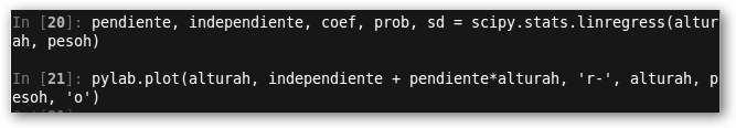 Comprobamos gráficamente que la recta de regresión que nos propone linregress se ajusta a los puntos. Observa que con pylab.plot dibujamos tanto la recta de regresión como la nube de puntos de las alturas y los pesos. Para la recta de regresión tomamos como “X” la altura de los varones (alturah) y como “Y” independiente + pendiente*alturah. |