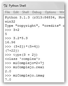 Teclea: 1/2+3/4, 3**2 (=32), 7%2 (7 módulo 2), … Sin embargo, es mucho más. Es un lenguaje de programación que entre sus tipos base está el complejo: type(3+2j) devuelve que pertenece a la clase complejo. Podemos realizar todas las operaciones básicas con ellos. Observa que hemos definido un complejo y accedido a su parte real e imaginaria. |