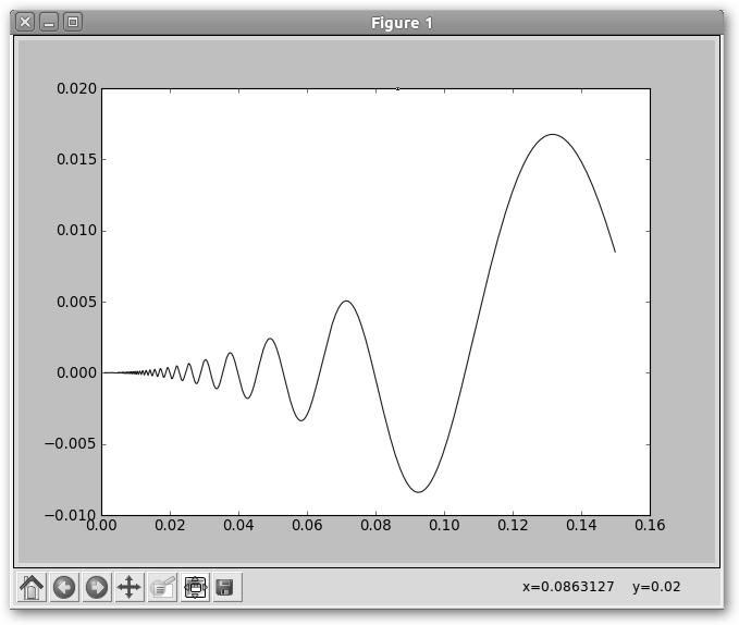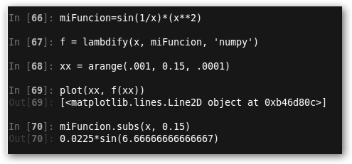 * In[66]: Definimos una función. * In[67]: Transformamos nuestra función en una función lambda conveniente para cálculos numéricos posteriores. Indicamos que las funciones definidas en ella las tome de numpy (el seno). * In[68]: Vamos a graficar nuestra función. Definimos el rango en el vector x. Queremos como punto inicial .001, como punto final 0.15 e incremento .0001 * In[69]: Graficamos nuestra función con plot y como argumentos: la función y el rango de valores. * In[70]: Evaluamos nuestra función en 0.15. |