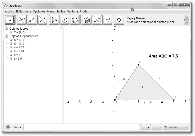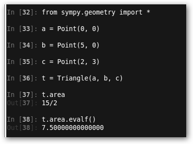 También podemos hacer Geometría con SymPy. Hemos creado un triángulo y calculado su área. Prueba: c = Circle(a, 5); c.area (25Π), intersection(c,t) (5, 0), etc. |
