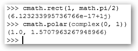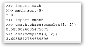 ¡Python viene con las baterías cargadas! Al importar las librerías math (import math) y cmath añades múltiples funciones. Sirvan como primeros ejemplos: la raíz cuadrada de 9 y el argumento y el módulo de un número complejo: cmath.phase(complex(3,2)) devuelve el argumento y abs(complex(3, 2)) el módulo. |