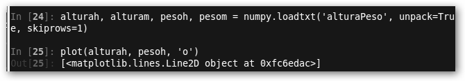 Observa las dos líneas de código: 1. alturah, alturam, pesoh, pesom = numpy.loadtxt('alturaPeso', unpack=True, skiprows=1). En la primera línea leemos el archivo alturaPeso. Con el segundo argumento unpack=True indicamos que las distintas columnas las vamos a leer en las variables alturah, alturam, pesoh y pesom. |