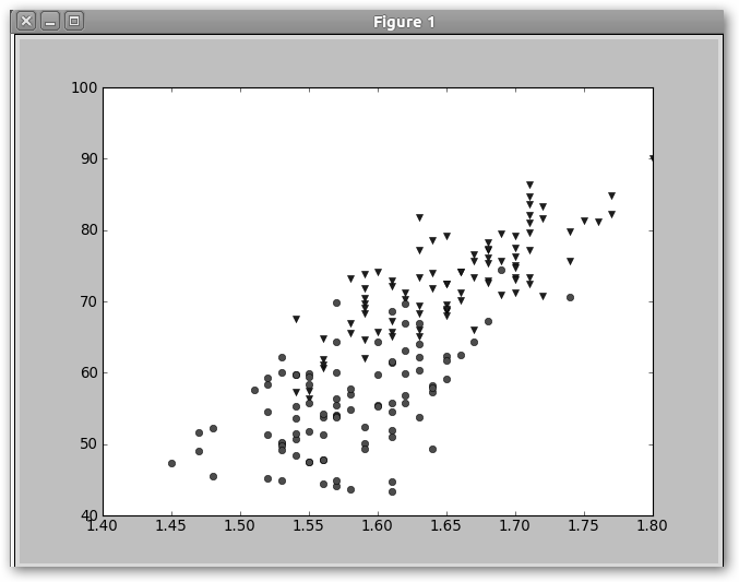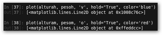 3. Comparemos los dos géneros: los varones los pintaremos como triangulitos azules (‘v’) y las mujeres como círculos rojos (‘o’). Observa el argumento hold=”True” para poder superponer los dos gráficos.