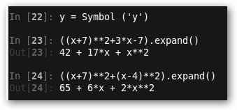 * In[22]: Agregamos “y” como otra variable lista para usar. * In[23] e In[24]: Expandimos varias expresiones. Sería el concepto contrario a la simplificación. |