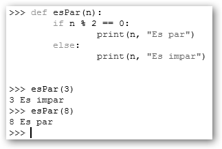 Empecemos definiendo una función esPar con argumento n. Una función es un trozo de código que se define una única vez y puede ser llamado (utilizado) tantas veces como queramos. En Python, el ámbito de una función y de los bloques de código lo determina el identado. Dentro de esta función hay una estructura de control if if n % 2 == 0: |