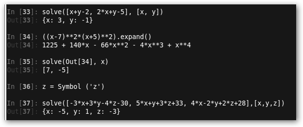 * In[33] e In[37]: Resolvemos sistemas de dos y tres ecuaciones con dos y tres incógnitas respectivamente. * In[35]: Resolvemos la ecuación Out[34] y obtenemos que sus dos raíces son 7 y -5. Ya lo sabíamos pues en In[34] habíamos solicitado expandir la expresión (x-7)2(x+5)2. |