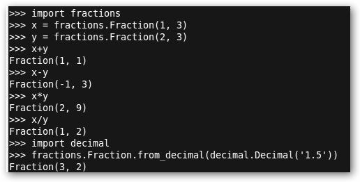 Las funciones rect y polar convierten un complejo a coordenadas cartesianas y polares respectivamente. Comprueba siempre el error, aunque es pequeñito, de redondeo. Obviamente las coordenadas cartesianas del complejo con módulo 1 y argumento Pi/2 es j. También podemos trabajar con fracciones importando la librería fractions (import fractions). Observa que al sumar dos fracciones, el resultado se ha simplificado (3/3=1/1). Además, podemos construir fracciones a partir de decimales (1.5); para ello creamos primero el decimal (decimal.Decimal(‘1.5’)) y se lo pasamos al método de Fraction from_decimal (requerimos la librería decimal). |