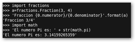 Mostramos dos ejemplos más sobre cadenas: formatear fracciones a la forma en la que estamos habituados (format) y la conversión de Π (math.pi) a cadena (str). |