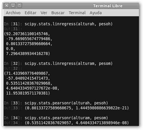6. La función pearsonr calcula la relación entre dos conjuntos. El primer valor que devuelve es el coeficiente de correlación de Pearson y el segundo la probabilidad asociada. Independiente del género, la altura y el peso están relacionados pues las probabilidades están muy próximas a cero y nos permite rechazar la hipótesis de independencia. 7. linregress devuelve la recta de regresión. Más concretamente, la pendiente, el término independiente, el coeficiente de Pearson, su probabilidad asociada (nivel de significación) y la desviación típica del error estimado. |