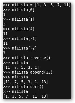 El manejo de las listas en Python es como se muestra en la ilustración: 1. miLista = [1, 3, 5, 7, 11] crea una lista. 2. Los elementos de la lista se enumeran empezando en 0: 1 es miLista[0], 3 es miLista[1], etc. 3. El último elemento está en la posición -1 (miLista[-1] es 11), el penúltimo en -2, etc. 4. miLista.reverse() invierte la lista. 5. miLista.append(13) añade 13 al final de la lista. 6. miLista.sort() la ordena. |