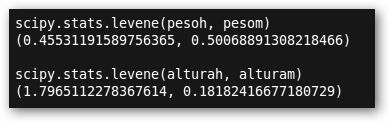9. La función levene realiza el test de Levene que comprueba la hipótesis nula de que las muestras pasadas como argumento tienen la misma varianza. Devuelve el estadístico y el nivel de significación, en ambos casos mayor a .05. No rechazamos la hipótesis nula, aceptamos que las varianzas son homogéneas y podemos aplicar “sin problemas” el contraste de hipótesis anterior. |