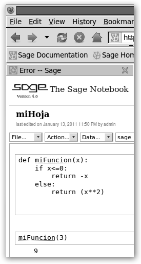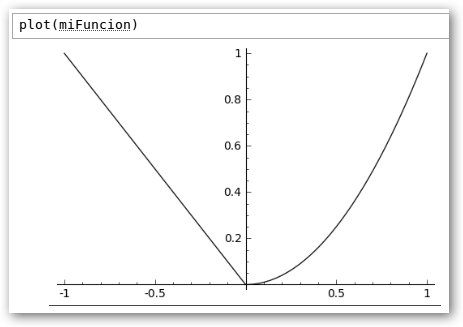 Lo que nos interesa en este momento es que podemos incrustar código Python en Sage. En el ejemplo, definimos la siguiente función a trozos: miFuncion(x)=