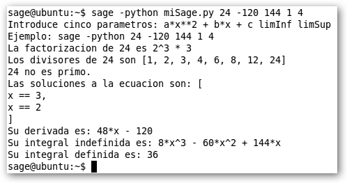 import sys from sage.all import * # Importamos las librerías necesarias. […] a, b, c, x = var(‘a b c x’) a = sage_eval(sys_argv[1]) b = sage_eval(sys_argv[2]) #Indicamos que las variables a, b, c y x serán utilizadas; las tres primeras serán inicializadas con el 2º, 3er y 4º argumento que se le pase al script. Nuestra función es un script que será invocado como sage –python miSage.py 24 -120 144 1 4. La llamada al script es sage –python miSage.py y los argumentos son: 24 (sys_argv[1]) -120 (sys_argv[2]) 144 1 4 |