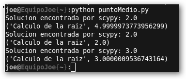 Veamos un código Python (crea un fichero puntoMedio.py) donde vamos a encontrar las raíces de funciones, así como, vamos a mostrar gráficamente nuestro resultado.