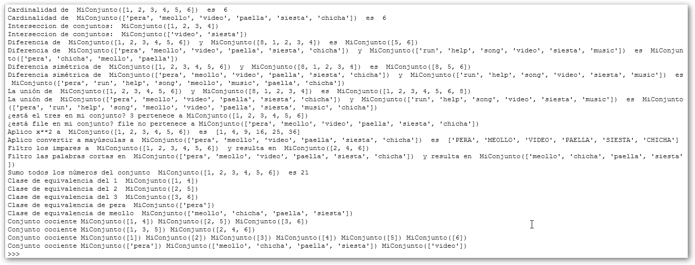 ¿Y si solicitamos: print "Conjunto cociente", ConjuntoCociente(c, lambda x, y: x[0]==y[0])? Efectivamente, recuperamos el conjunto cociente de la relación de equivalencia de las palabras que empiezan por la misma letra: Conjunto cociente MiConjunto(['pera', 'paella']) MiConjunto(['meollo']) MiConjunto(['video']) MiConjunto(['siesta']) MiConjunto(['chicha']).