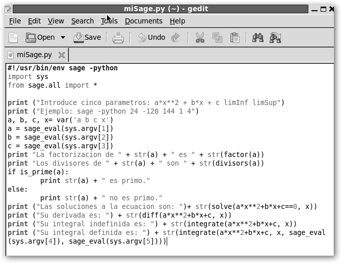 hay más 1. Editamos un archivo con extensión .py en una máquina con Sage instalado (por ejemplo, su máquina virtual). 2. Escribimos el siguiente código: (las almohadillas “#” son comentarios) #!/usr/bin/env sage -python