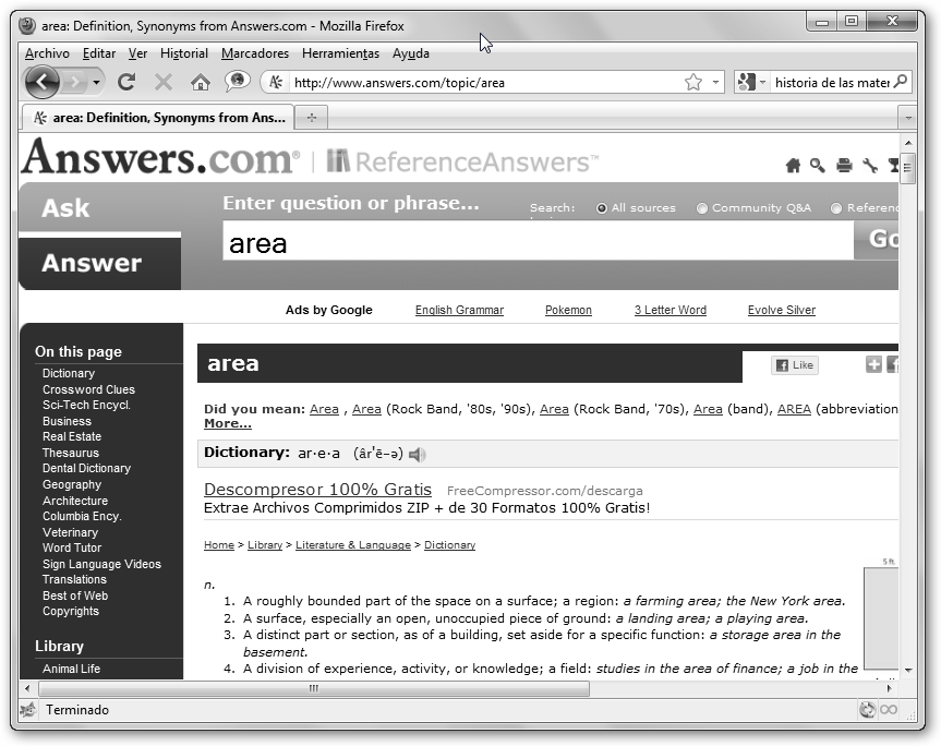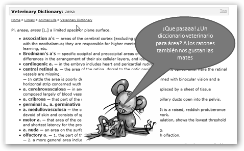 Observa la continuación de la respuesta de Anwers.com. Vemos vídeos relacionados con el concepto, fórmulas para el cálculo del área de diferentes figuras geométricas (triángulo, rectángulo, cuadrado, paralelogramo, etc.), tesauro, traductor, un diccionario veterinario… ¡si, has leído bien! |