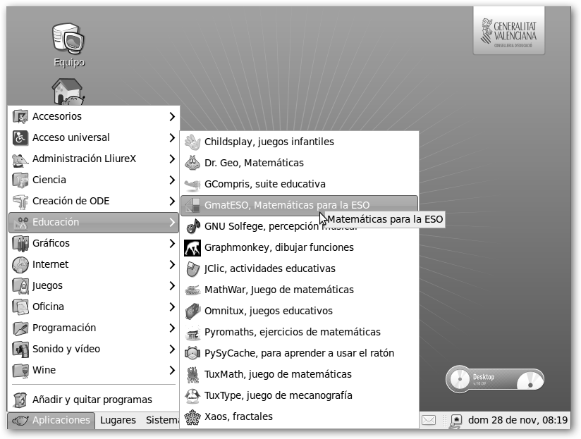 * Por supuesto, muchas comunidades tienen su propia distribución: MoLinux (www.molinux.info) es la de la Comunidad de Castilla-La Mancha, Lliurex (lliurex.net) de la Generalitat Valenciana, Linkat (linkat.xtec.cat) de la Generalitat de Catalunya, Max de la Comunidad de Madrid (www.educa2.madrid.org/web/max/), LinEx (www.linex.org) de la Junta de Extremadura, etc. * Edubuntu en edubuntu.org es el sabor educativo de Ubuntu, la distribución más popular de GNU/Linux, así como, Mathbuntu definida como Math + Ubuntu en www.mathbuntu.org cuyo objetivo es proporcionar el mejor software de código abierto en matemáticas y una biblioteca de libros gratuitos. Esta versión incluye: SAGE, Maxima, R, Octave, GeoGebra, LyX, pero sólo es gratuito un script para actualizar de Ubuntu a Mathbuntu, no ofrecen libre ninguna ISO. |
