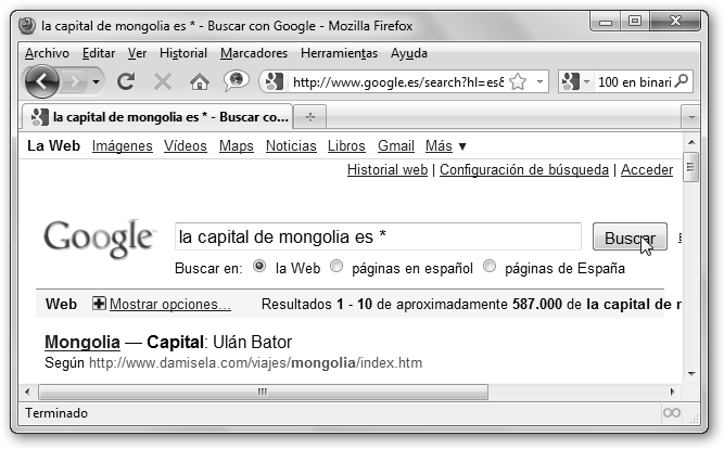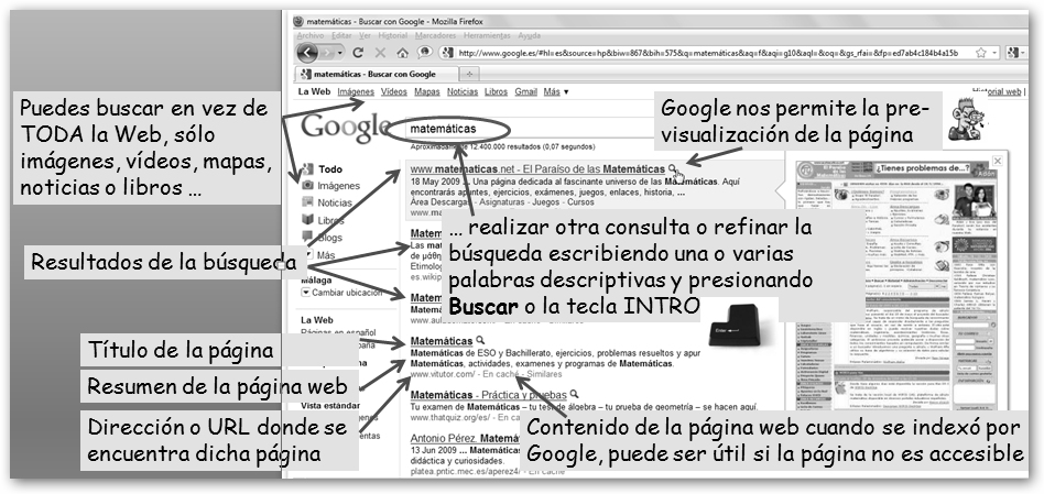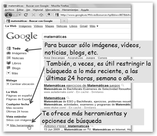 * Encontrar resultados que contengan la frase exacta (muy útil para encontrar textos literarios, refranes y dichos, la cadena a buscar se encierra entre comillas: “las matemáticas no mienten, lo que hay son muchos matemáticos mentirosos”), todas o alguna de las palabras o excluir resultados que contengan ciertas palabras. * Seleccionar si deseas resultados en cualquier idioma (opción por defecto) o que sólo te proponga páginas en español, inglés, etc. * Además, puedes buscar contenido en un dominio o portal determinado. Sin utilizar la búsqueda avanzada escribe en el cuadro de búsqueda: cadenaABuscar site:dominio. |