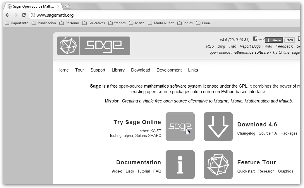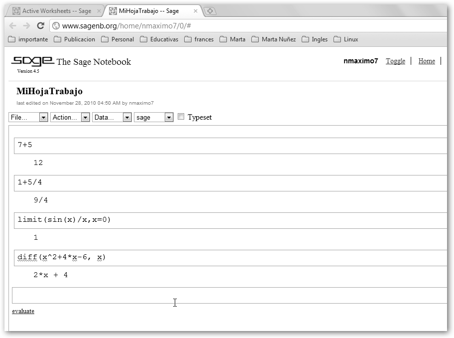 Haz clic en Try Sage Online y podrás registrarte y utilizar esta herramienta 2.0. En la figura se muestra la realización tanto de cálculos triviales (7+5=12, 1+5/4=4/4+5/4=9/4) como otros más complejos. |