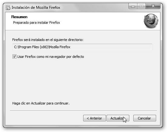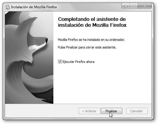 Ya estamos acabando, pulsa Actualizar o Siguiente (si no tenías una versión previa de Firefox en tu PC) y en la siguiente ventana Finalizar. |