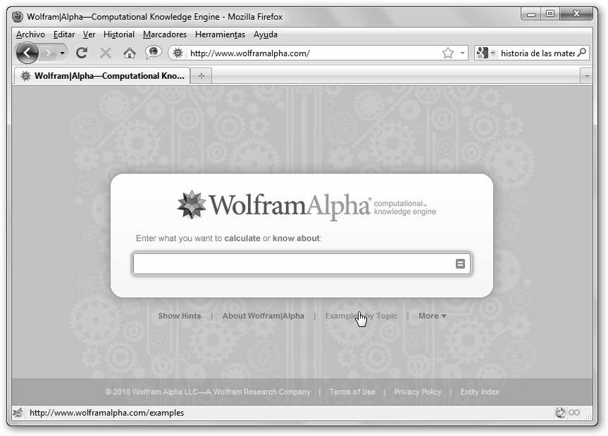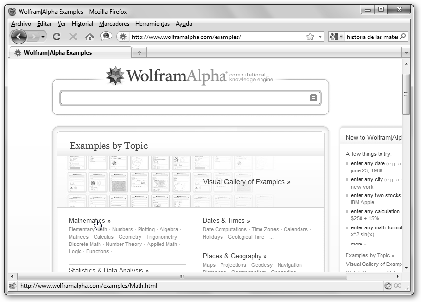 Navega a Wolfram Alpha escribiendo en la barra de direcciones de tu navegador www.wolframalpha.com. Para ver distintos ejemplos que te ilustren como utilizar esta magnífica herramienta del autor de Mathematica selecciona Examples by Topic, Mathematics. Como puedes comprobar se nos presenta una galería de ejemplos organizados por materias y hemos elegido Matemáticas. |