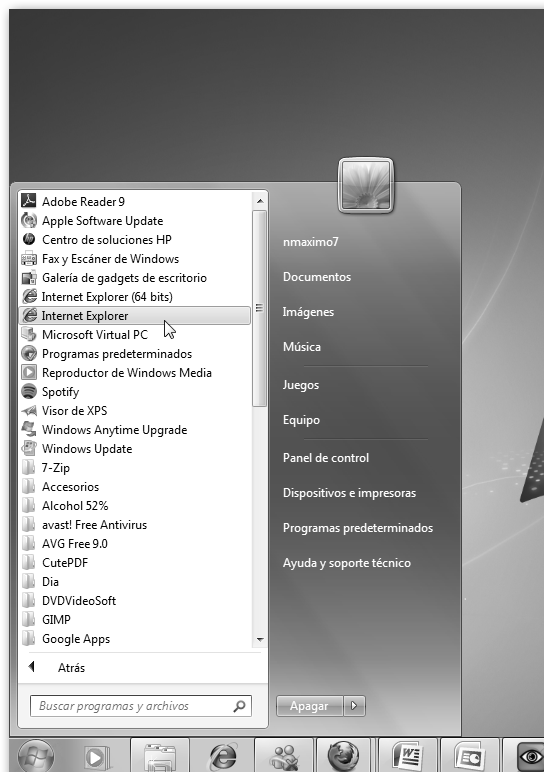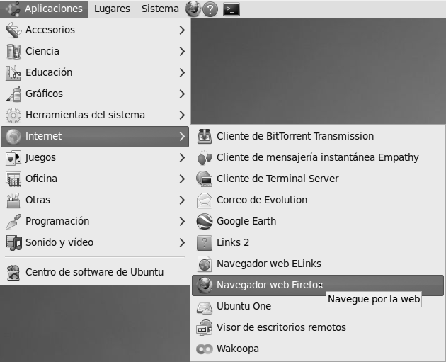 Veamos, por ejemplo, cómo lanzar un navegador. Basta con hacer clic primero en Inicio y luego en Internet Explorer. Observa que Windows te muestra una lista con las aplicaciones de uso más frecuente. Si no está tu aplicación en dicha lista, haz clic en Todos los programas. En Linux las aplicaciones se encuentran organizadas por categorías: Accesorios, Ciencia, Educación, Gráficos, etc. En nuestro ejemplo navegaríamos por Aplicaciones, Internet, Navegador web Firefox. |