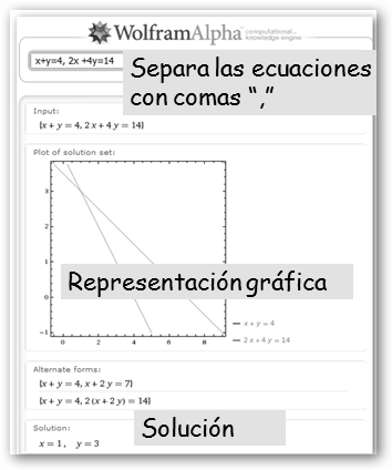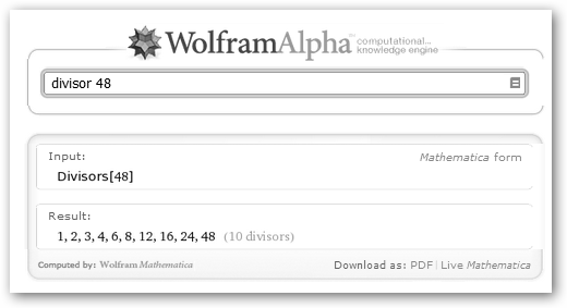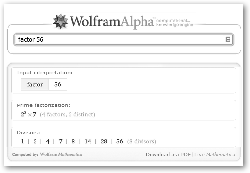 Otros ejemplos son: * Conversión entre el sistema decimal y otros sistemas: 324 to binary, cambia 324 a binario; 1275 to base 16, pasa 1275 al sistema hexadecimal {0,1,…9, A,…F}; 247 to Roman numerals, convierte 247 a números romanos. * Cálculos aritméticos: 7^3, es 73=343; 4/3 * (5 + 3/2) + 1/3 es 9; sqrt 129, raíz cuadrada de 129. * Descontar el IVA (p.e. 16%) a una determinada cantidad: €200 -16% devuelve 168 euros. * Escribe cualquier número, por ejemplo, 120 y nos muestra su representación en una recta, su forma binaria 11110002 y en números romanos (CXX) y su factorización (23*3*5). Además, nos informa que es par y que 120=5!=22+42+102. * Operaciones con números complejos: (3+4i)*(7-2i). * Cálculo de π con 10.000 decimales: pi to 10000 digits. * Obtención del término general de una serie: 1, 3, 5, 7, 9 descubre que es 2n-1; 1, 4, 9, 16, 25 es an=n2; 2, 5, 10, 17, 26 es an=n2+1. Cálculo de las series: 1/2 + 1/4 + 1/8 + 1/16 + ... da como resultado 1, 1/4 + 1/16 + 1/64 + 1/256 +... daría el mismo que la serie 1/2 − 1/4 + 1/8 − 1/16 +..., 1/3. * Geometría: cálculo del área y perímetro de una circunferencia dado su radio (circle, radius=7), área, perímetro, tipo y ángulos interiores de un triángulo dados sus lados (5, 7, 9 triangle), representación, propiedades y fórmulas de cualquier figura geométrica (hexagon, triangle, square, torus), representación y volumen de un cilindro dados su radio y altura (cylinder, radius=2, height=5), etc. A continuación, veremos cómo resolver un sistema de ecuaciones, el cálculo de los divisores de un número (divisor 48) y la descomposición de un número en factores primos (factor 56). |