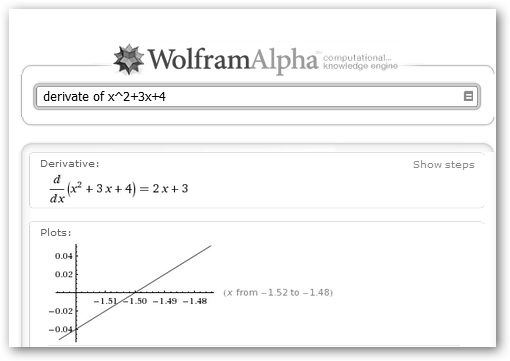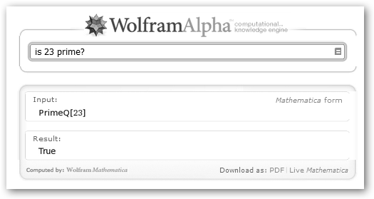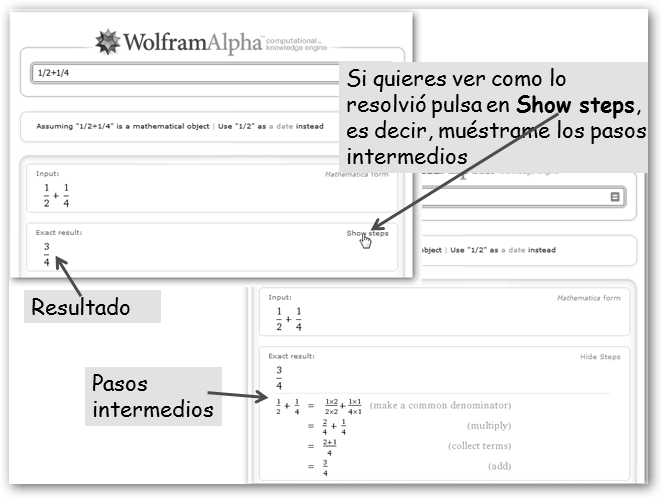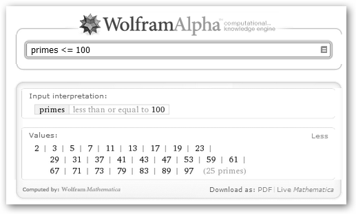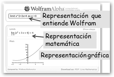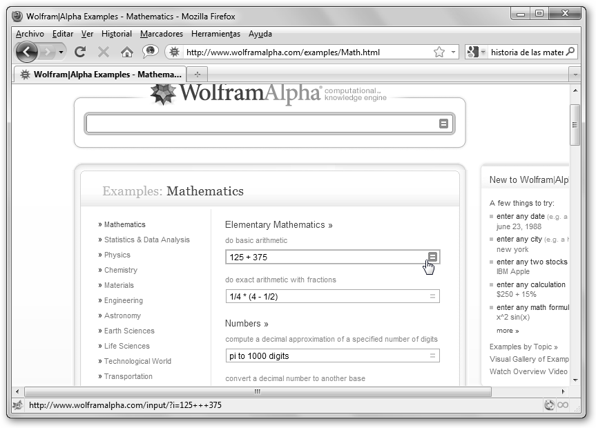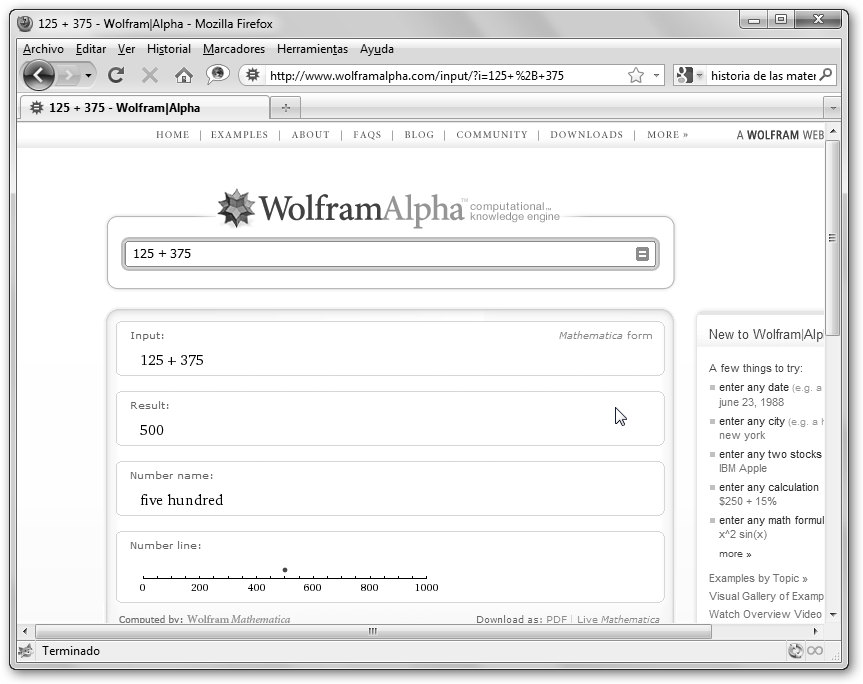 Observa la batería de ejemplos relacionados con las mates. Si haces clic sobre el primero 125+375, una simple operación aritmética, observarás: * Input: La entrada tal como la interpreta Wolfram Alpha. * Result: resultado, en el ejemplo, 500. * Number name: five hundred, quinientos en inglés. * Number line: representación del número en la recta real. |