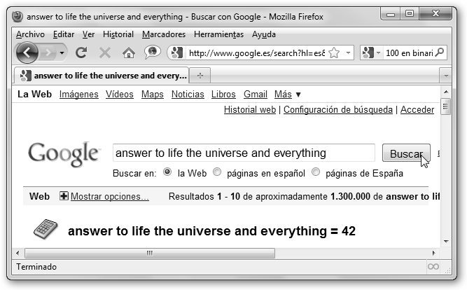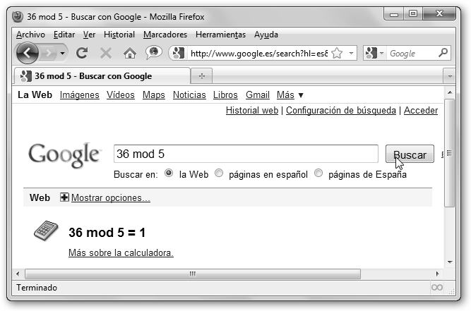 * Puedes realizar cálculos con la calculadora de Google: PI*3, sin(0), 35*5, 11!, 35% de 200, etc. * Conversor de unidades, sistemas de numeración, etc.: 2$ en euros, 1 cm en pulgadas, 19 in binary (19 en binario: 10011), etc. |