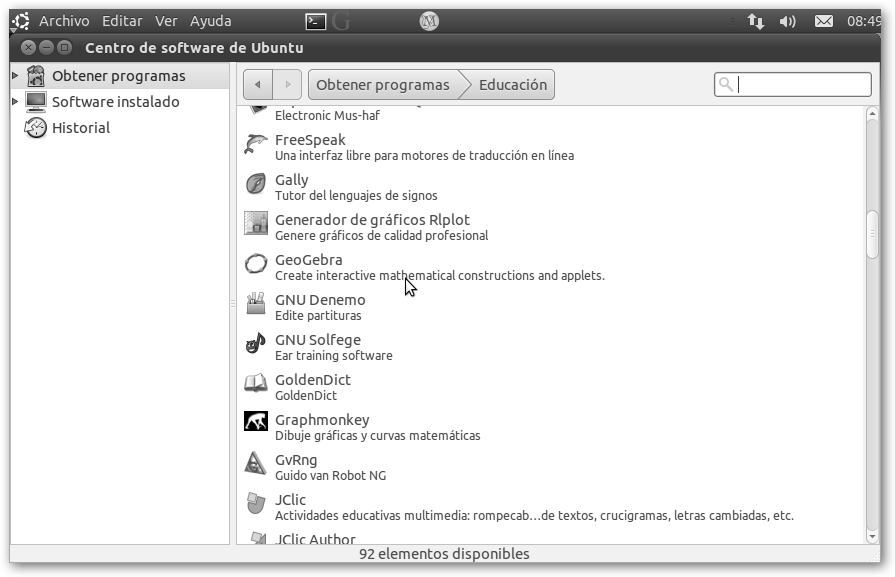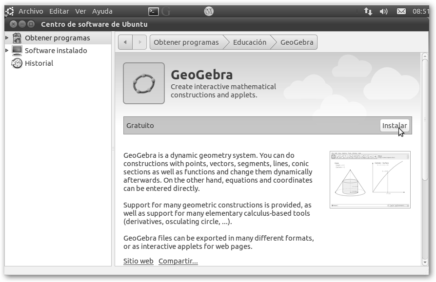 Elige una categoría o departamento, en nuestro caso, Educación. Te saldrá un listado de aplicaciones de la categoría Educación. Haz clic sobre la aplicación a instalar, seleccionaremos GeoGebra. Observa el cuadro de búsqueda en la esquina superior derecha para encontrar las aplicaciones más rápidamente. |