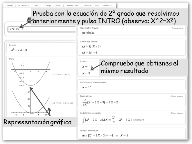 Aquí ejemplificaremos para matemáticas, pero WolframAlpha tiene muchas más posibilidades. Por ejemplo, si escribimos España nos devuelve nuestra bandera, el mapa, datos demográficos, idiomas, la moneda, la capital, ciudades más importantes, etc. Podemos preguntarle nuestra dirección IP, localización y coordenadas: where am I; el tiempo en nuestra ciudad: weather miCiudad o la hora y la fecha, now; información nutricional, calorías y carbohidratos de un zumo de naranjas orange juice. Si quieres el significado de una palabra teclea define palabra (p.e. teclea: define triangle) y para sus sinónimos synonyms palabra. |