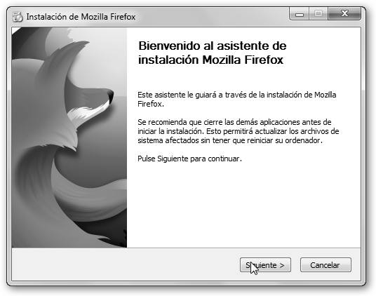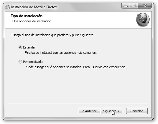 Seleccionaremos la instalación estándar porque es la más sencilla, cómoda y nos dejará Firefox instalado con las opciones más comunes. Los típicos asistentes de instalación incluyen las siguientes pantallas: Bienvenida, Idioma, Tipo (estándar, completa, mínima), Aceptación del contrato (si no lo aceptas no te permite la instalación del software), Carpeta de destino, Iconos en el escritorio, Pantalla de Resumen o de Finalización del asistente (normalmente con la opción Ejecutar la aplicación ahora seleccionada). Normalmente dejar las opciones por defecto es lo mejor, es decir, Siguiente, Siguiente, Siguiente… y Finalizar. |