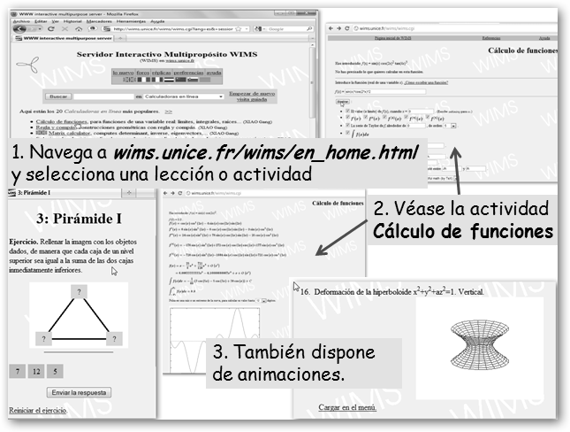 3. WIMS en wims.unice.fr/wims/en_home.html. También, puedes disponer de éste último en wims.auto.u-psud.fr/wims/.Se trata de un servidor interactivo de matemáticas online, tal como puede leerse en su página web “podemos consultar libros de textos interactivos, responder a ejercicios matemáticos, hacer cálculos y trazar curvas o superficies, o practicar juegos matemáticos” a clic de ratón. Si no tienes Internet, puedes utilizar la distribución KNOWIMS en wims.unice.fr/knowims para disponer de un Live-CD de GNU/Linux que ya trae un servidor WIMS “de fábrica”, sin tener que instalarlo.