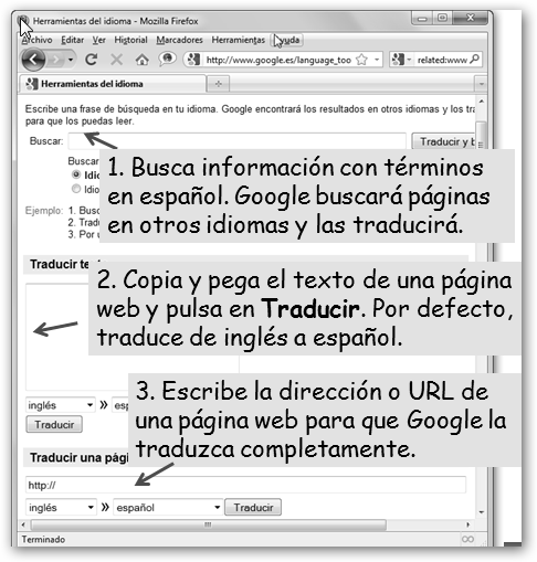 * O eliminar palabras no deseadas directamente desde el cuadro de búsqueda, así programas matemáticos -derive nos devuelve páginas sobre software alternativo al “privativo” Derive. * Finalmente, en Internet existen muchos recursos en inglés. Aunque existen servicios muy interesantes como www.wordreference.com, Google te propone una serie de herramientas de idioma en www.google.es/language_tools. |