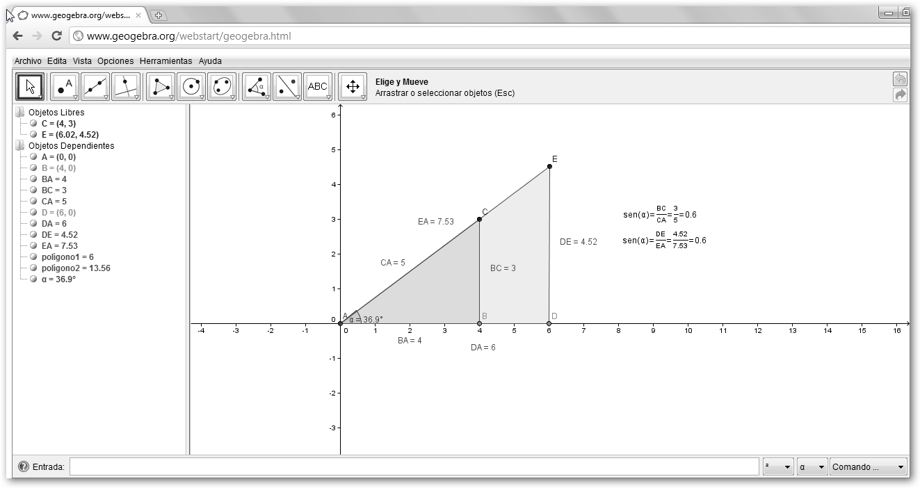 2. Geogebra online: veremos en el capítulo 3 esta magnífica herramienta de geometría dinámica, libre e interactiva. Por ahora, puedes comprobar que hay disponible una versión online en www.geogebra.org/webstart/geogebra.html. Observa que estamos trabajando el Teorema de Thales. |