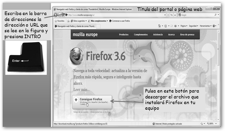 Vamos a instalar un programa en Windows, por ejemplo, Mozilla Firefox. Lo primero que tendrás que hacer es navegar a la dirección web donde se pueda descargar, en nuestro ejemplo, http://www.mozilla-europe.org. Sigue la secuencia Inicio, Internet Explorer. Si encuentras al navegar algo así…