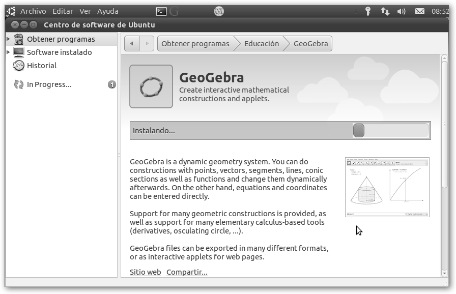Sólo te queda esperar (observa en el panel izquierdo En progreso (1)) y lanzar tu aplicación, en el ejemplo desde Aplicaciones (logotipo de Ubuntu), Educación, GeoGebra. |