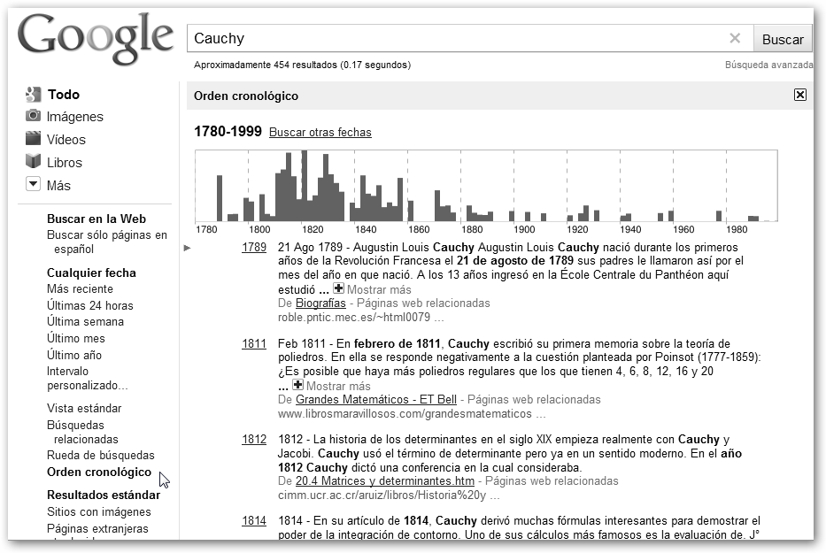 Con Orden cronológico podemos realizar una búsqueda cronológica, es decir, de lo más antiguo a lo más reciente. Muy útil para conocer la historia, evolución de un término o la bibliografía de algún matemático ilustre (Cauchy, Gauss, Pitágoras, Euclides, etc.) |